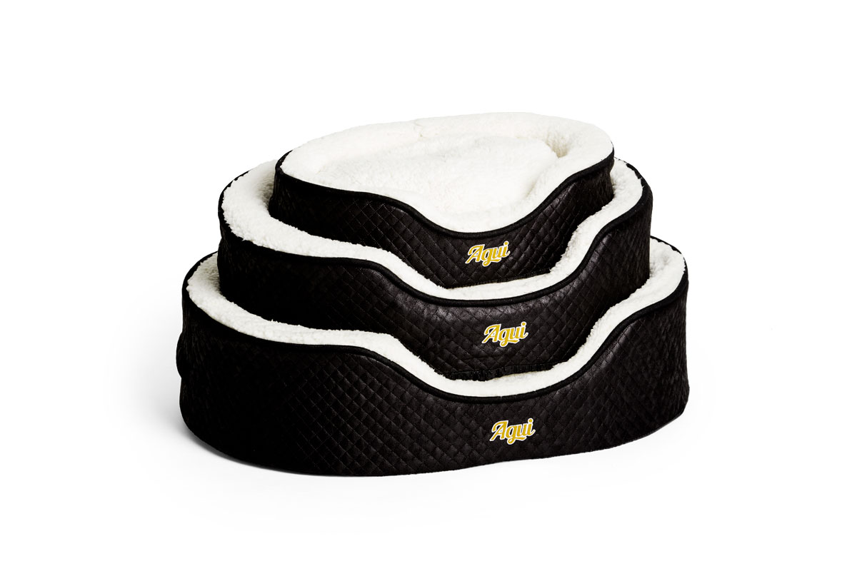 Cama oval revestida a pele preta sintética costurada em padrão diamante em contraste com o revestimento interior em lã sintética.